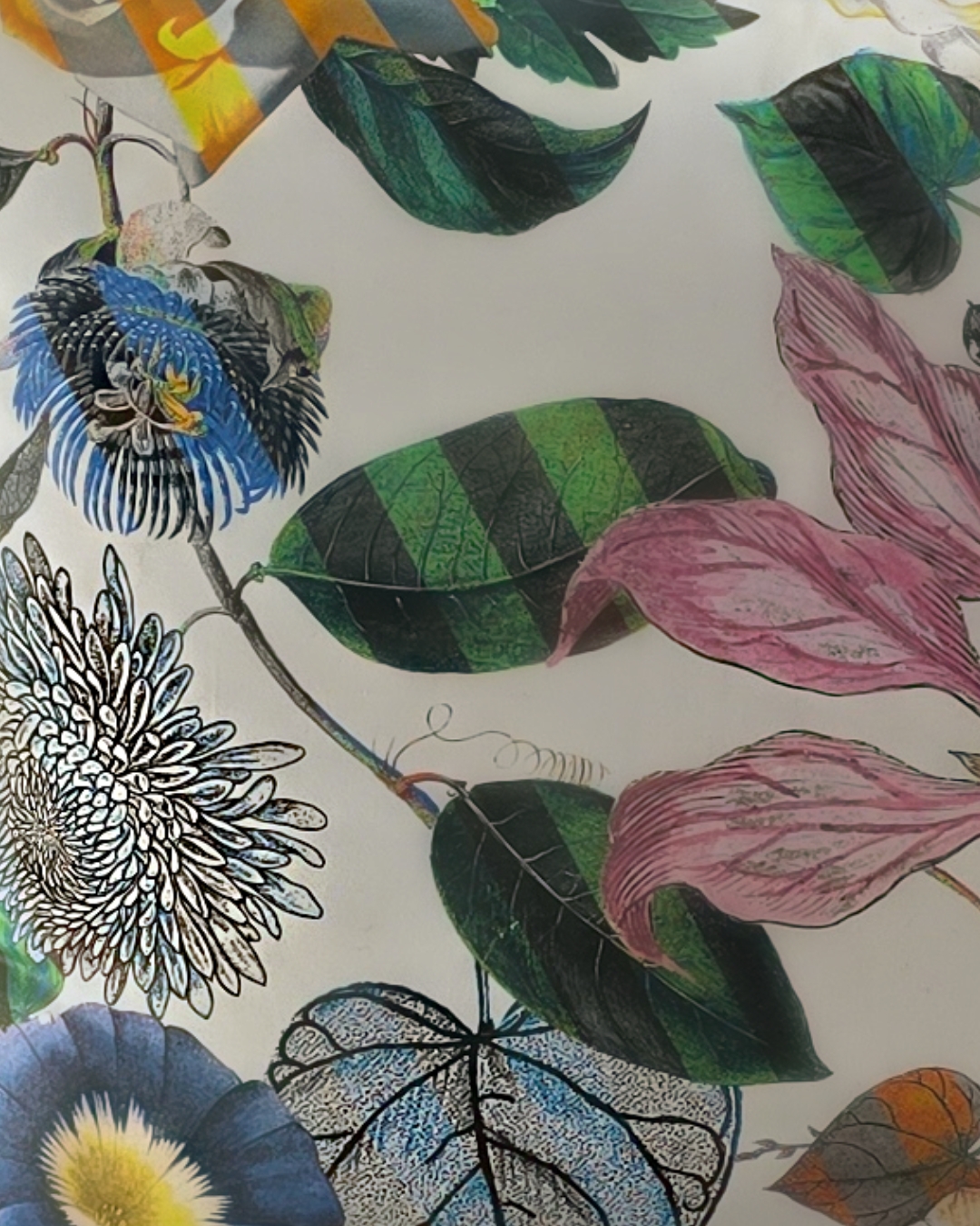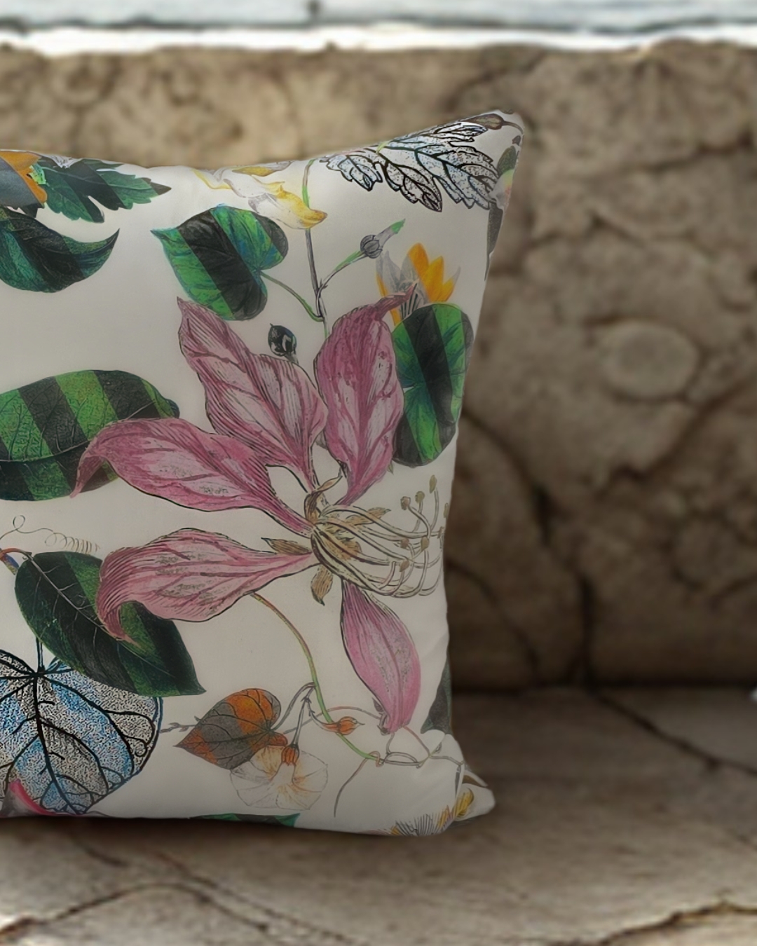Cojín confeccionado en satén de algodón con un diseño impreso multicolor floral combinado con rayas en color opiat de CHRISTIAN LACROIX para DESIGNERS GUILD. Relleno de fibra tacto suave incluido.
