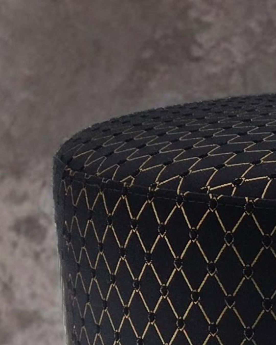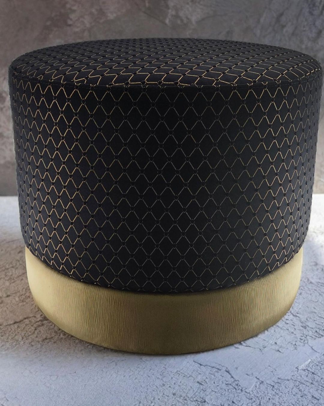 puf cilíndrico minimalista con zócalo, está confeccionado con satén