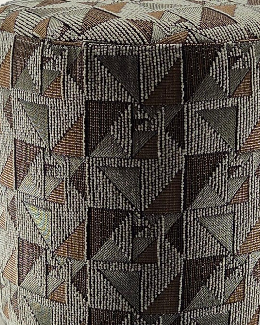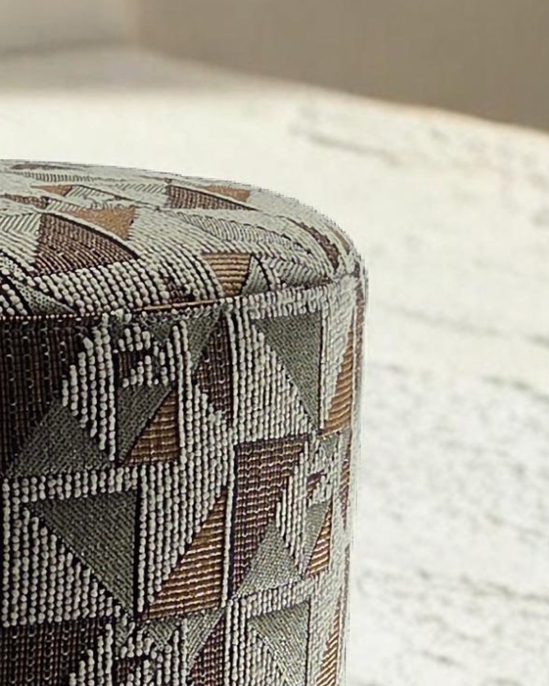 El puf IBIZA es un puf cilíndrico minimalista confeccionado con tejido Embelli en color Nuances immorteles de ELITIS que combina distintas texturas con hilos metalizados de tonos dorados, estructura de madera de pino y tableros de fenólico con gomaespuma de alta resistencia.